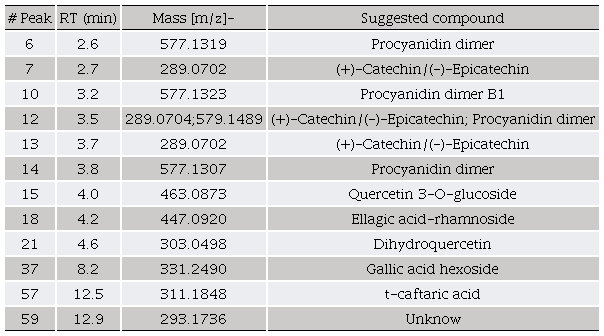 The polyphenolic profiles of Q. sideroxyla shown in Table 2 includes procyanidin dimer of catechin/epicatechin compounds (peaks 6, 10, 12, and 13) which is, by far, the dominant polyphenols in bark extract from this species, also reported in previous studies (Rosales et al., 2012). Other compounds present in the extract also compared with previously reported literature, resulted in the tentative identification of constituents such as Quercetin 3-O-glucoside and t-caftaric acid ([M-H] - 463 and 311 respectively; Pardo-García et al., 2014), Ellagic acid-rhamnoside ([M-H]-447; Santos et al., 2013) gallic acid hexoside ([M-H]- 331; Lorenz et al., 2016), taxifolin ([M-H]- 303; Rosales et al., 2017). Other unknown compounds reported in barks detected in both extracts are also included ([M-H] - 293; Mämmelä et al., 2000).