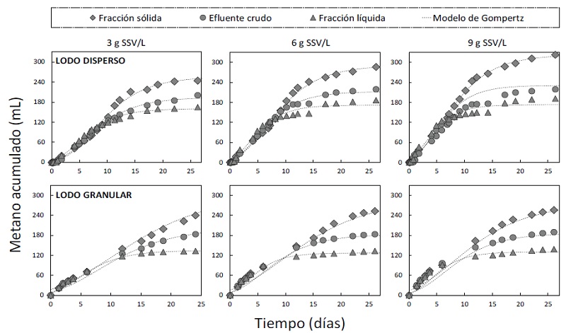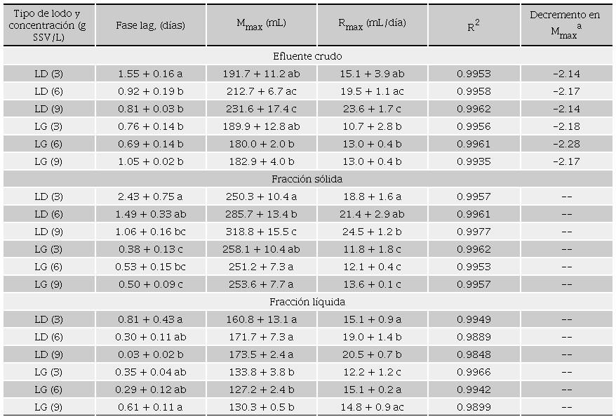 La estrategia de separación del efluente porcino en fracciones sólida y liquida, así como las distintas condiciones del inóculo tuvieron un impacto sobre la fase lag, Mmax y Rmax, obtenidas con el modelo de Gompertz (Tabla 2). En general, para los tres tipos de agua residual, los valores de Mmax con el lodo disperso fueron más altos que con el lodo granular, sin embargo, en algunos casos no hay diferencia estadística significativa entre los tipos de lodo usado. También, el resultado de Mmax fue mayor utilizando la FS, aun cuando esta fracción tiene una concentración de DQO menor a la del EC. El valor de Mmax con el EC y utilizando lodo disperso con 9 g SSV/L fue el más alto, alcanzando 231.6 mL, pero es estadísticamente similar al obtenido con 6 g SSV/L que alcanzó 212.3 mL. En tanto, con el lodo disperso a 3 g SSV/L no hubo diferencia significativa al compararlo con las tres concentraciones de lodo granular. Con la FS, el valor de Mmax más alto también se obtuvo con el lodo disperso a una concentración de 9 g SSV/L, que estadísticamente es diferente a los valores obtenidos con los otros tratamientos de la FS. Para la FL, Mmax es estadísticamente similar para las tres concentraciones de lodo disperso, pero mostraron diferencia respecto a las tres concentraciones del lodo granular (Tabla 2). La estrategia de separación y posterior digestión de la FS y FL permitió incrementar la cantidad total de metano acumulado en comparación a la digestión del EC. Es decir, en todos los casos la suma de Mmax de las FS y FL es mayor a la cantidad de metano producido por el EC, si se comparan los resultados entra las mismas concentraciones, evidenciado por una producción entre 2.14 y 2.28 veces menor con el EC (Tabla 2).