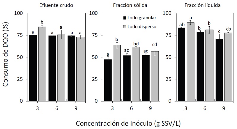 El consumo de la materia orgánica contenida en las diferentes fracciones se muestra en la Figura 2. En general, la eficiencia de consumo, expresada como DQO, fue mayor utilizando el lodo disperso en relación con el lodo granular. Sin embargo, el análisis estadístico indica que no existen diferencias significativas entre algunas condiciones probadas. Por ejemplo, para los cultivos con el EC, la eficiencia alcanzó ~75 % con ambos lodos, y no se presentaron diferencias significativas, con excepción de la concentración a 3 g SSV/L con el lodo disperso, que alcanzó 85 % y que es estadísticamente diferente al resto. Los cultivos con la FS fueron en los que se presentaron las eficiencias de consumo de DQO más bajas, con valores que van desde 47.5 % a 63.8 %. En este tipo de agua residual el consumo de DQO con el lodo granular no mostró diferencia estadística entre las tres concentraciones de inóculo, pero si fueron estadísticamente diferentes con los resultados obtenidos con el lodo disperso inoculados con 3 y 6 g SSV/L, alcanzando valores de consumo más altos (Figura 2). En los cultivos con la FL las eficiencias de consumo de DQO tuvieron un rango entre 71 % a 89 %, alcanzándose los valores más altos para la concentración de 3 g SSV/L, tanto para el cultivo con el lodo granular y disperso, en donde no hay diferencia estadística significativa entre sus medias.