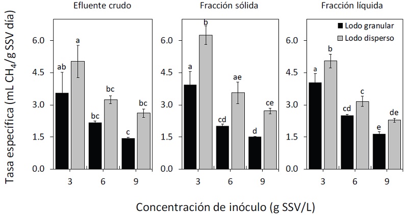 De manera similar a la Mmax, la Rmax presenta valores más altos tanto con el uso de lodo disperso y la FS (Tabla 2). Para ejemplo, los valores de Rmax alcanzados con la FS inoculados con el lodo disperso se incrementaron 1.59, 1.76 y 1.80 veces en comparación con los cultivos con el lodo granular para las concentraciones de 3, 6 y 9 g SSV/L, respectivamente, encontrando diferencia significativa entre ambos tipos de lodo. Los cultivos con el lodo disperso con 6 y 9 g SSV/L, bajo los tres tipos de agua residual, alcanzaron los valores de Rmax más altos y mostraron diferencia significativa con el resto de los tratamientos. La tasa especifica de producción de metano resultó mayor al utilizar el lodo disperso en comparación con el lodo granular para los tres tipos de muestras de agua residual. Además, se encontró que entre menor fue la concentración de inoculo utilizada, las tasas especificas fueron más altas (Figura 3). Por ejemplo, para la FS y lodo disperso a 3 g SSV/L, la tasa específica alcanzó 6.25 mL CH4/g SSV·día, en contraste, con 9 g SSV/L fue tan sólo de 2.72 mL CH4/g SSV·día, valores que presentan diferencia estadística significativa. Para el lodo granular sucedió algo proporcionalmente similar, en donde a la concentración de inóculo más baja se alcanzaron 3.94 CH4/g SSV·día, en tanto para 9 g SSV/L fue 1.51 CH4/g SSV·día, que son estadísticamente diferentes. Al comparar las tasas especificas entre ambos lodos para los cultivos con la FS, hay una diferencia importante (hasta 80 %), y en todos los casos para este tipo de agua residual, la diferencia estadística es significativa. Sin embargo, para la FL la diferencia fue menor (hasta 38 %), encontrándose que no hay diferencia significativa, excepto para la FL inoculado con 3 g SSV/L.