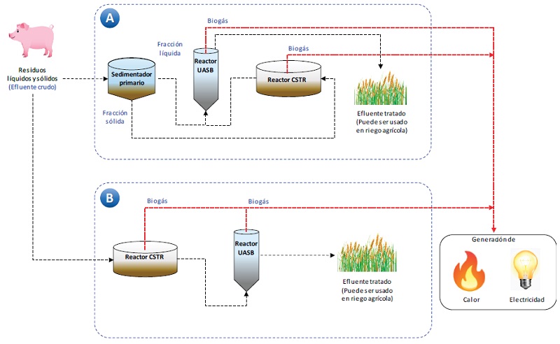 En este estudio se utilizó lodo granular y lodo disperso, sin embargo, el principal propósito no fue identificar cual éstos dos tipos de inóculos presenta una mayor capacidad de degradación. En tanto, el objetivo fue evaluar el impacto de separar las diferentes fracciones del agua residual porcina durante la digestión anaerobia utilizando diferentes inóculos. El lodo granular y lodo disperso representan el tipo de inoculo utilizado en los reactores UASB y CSTR, respectivamente, que son dos de los sistemas de digestión anaerobia más representativos. La Figura 4 presenta dos propuestas de tratamiento de los residuos generados en granjas porcinas. En uno de los casos se plantea el uso de un sedimentador primario para la separación inicial de las fracciones del agua residual y su posterior tratamiento mediante procesos anaerobios en un reactor tipo UASB para la fracción líquida y un reactor CSTR para la fracción sólida (Figura 4A). En la Figura 4B se plantea un tratamiento sin la separación de las fracciones, iniciando con la digestión anaerobia del efluente crudo en un reactor CSTR y posteriormente en un reactor UASB. En ambos casos de la Figura 4, el efluente del reactor UASB, conocido como digestato, puede utilizarse para riego agrícola debido a su contenido de nitrógeno y fósforo (Baştabak y Koçar, 2020). Además, el biogás generado en los reactores CSTR y UASB a partir de la digestión de las fracciones, puede ser utilizado para la generación de calor o electricidad (Kaparaju y Rintala, 2013), para el consumo en la granja o bien para proveer a pequeñas comunidades en función de la cantidad generada. Por último, los sólidos que se generen al final del proceso de tratamiento pueden ser utilizados para la producción de composta (Wang et al., 2018). Las propuestas de la Figura 4 son dos ejemplos de configuración de sistemas de tratamiento de los efluentes porcinos, pueden tenerse diferentes posibilidades dadas la necesidades, objetivos y recursos disponibles.