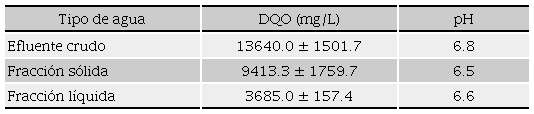 El agua residual y sus fracciones fueron analizadas para determinar el contenido de materia orgánica expresado como DQO (Tabla 1). La concentración de materia orgánica en el EC fue de 13,640.0 mg DQO/L. De esta concentración, el 69 % corresponde a la FS (9,413 mg DQO/L) y el porcentaje restante corresponde a la FL (3,685 mg DQO/L). La suma de la DQO determinada en las FC y FL corresponde en general a la DQO total en el EC. La concentración de DQO en este tipo de efluentes es muy variable, presentando valores desde 6,000 a 50,000 mg/L (Boursier et al., 2005), por lo que la muestra utilizada en este estudio contiene una DQO que se ubica en un rango bajo. Resulta interesante el hecho de que la eliminación física de los sólidos contenidos en el agua bajo estudio puede disminuir hasta el 69 % de la DQO, lo que se traduce en un agua que puede ser más fácilmente tratada. Actualmente en México son inexistentes o casi nulas las estrategias de tratamiento primario en granjas de cerdo encaminadas a eliminar sólidos mediante procesos de separación física. Normalmente los efluentes se conducen hacia los tratamientos secundarios en donde se utilizan lagunas anaerobias o facultativas medianamente tecnificadas (Garzón-Zúñiga y Buelna, 2014). Por otro lado, la separación sólido-líquida no tuvo un efecto considerablemente importante sobre el pH, ya que el valor en el EC fue 6.8 y bajó a 6.5 en la FS y a 6.6 en la FL. Esta ligera disminución en el pH pudiera no representar un efecto adverso sobre los microrganismos involucrados en la metanogénesis, puesto que el rango óptimo de pH para que este proceso ocurra es 6.8 a 7.2, pero puede tolerar de 6.5 hasta 8.0 (Cioabla et al., 2012).