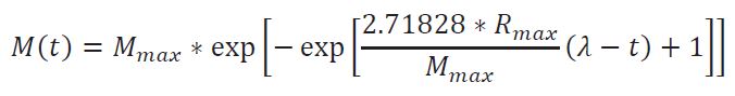 donde M (t) es el volumen (mL) de metano en un tiempo determinado, t es el tiempo (días), Mmax es la cantidad máxima de metano producido (mL), Rmax es la tasa máxima de producción de metano (mL/día) y λ es la fase lag (días). Tanto los parámetros del modelo Gompertz, así como un análisis de varianza y prueba Tukey se realizaron con Minitab 19 para determinar diferencias entre las medias (p < 0.05).