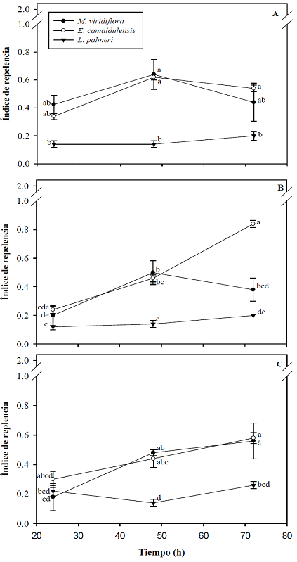 Además, el IR fue significativamente diferente para cada aceite esencial y tiempo de exposición en las diferentes dosis probadas, mostrando una interacción entre estos factores para las dosis de 10 y 15 μL/kg (Tabla 3). El aceite de L. palmeri mostró una mayor actividad repelente sobre los adultos de R. dominica en todas las dosis probadas con respecto a los otros dos aceites esenciales (Figura 1). El aceite de M. viridiflora fue el que obtuvo un IR intermedio y el E. camaldulensis fue el aceite que menor actividad repelente presentó para cada dosis probada (Figura 1 A, B). Sin embargo, al incrementar la dosis a 15 µL/kg no mostró diferencias significativas con respecto al aceite de M. viridiflora (Figura 1 C).