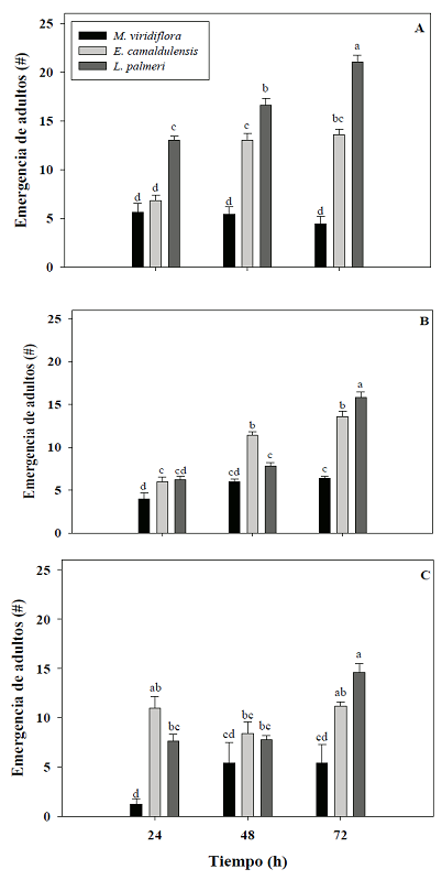 La emergencia de los adultos de R. dominica fue significativamente diferente para cada aceite esencial y tiempo de exposición probados, mostrando una interacción entre estos dos factores para cada dosis tratada (Tabla 4). El aceite de M. viridiflora presentó un mayor efecto sobre la emergencia de R. dominica con respecto a los otros dos aceites esenciales, donde solamente lograron emerger una media de 1.2 individuos en la dosis de 15 µL/kg a las 24 h de exposición (Figura 2 C). El aceite de E. camaldulensis fue el que mostró una emergencia intermedia en general del insecto en todas las dosis probadas (Figura 2). El aceite L. palmeri a una dosis de 5 µL/kg a un tiempo de exposición de 72 h fue el que obtuvo un menor efecto sobre la emergencia de R. dominica con una media de 21 adultos emergidos (Figura 1 A).