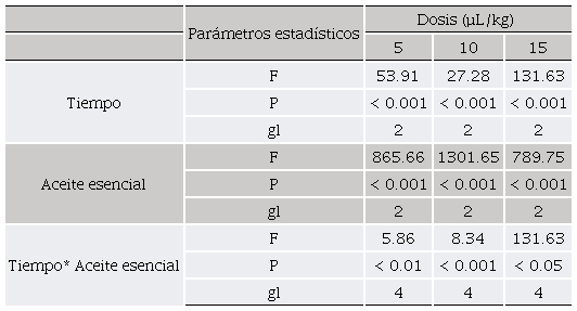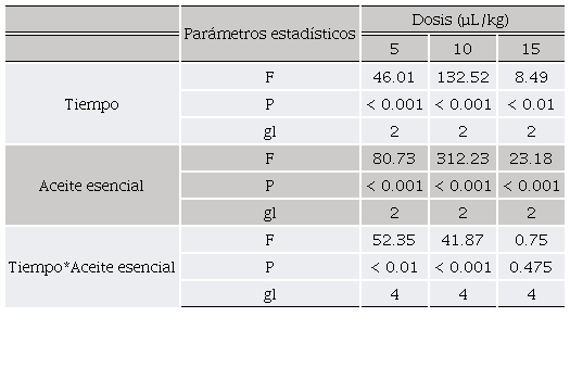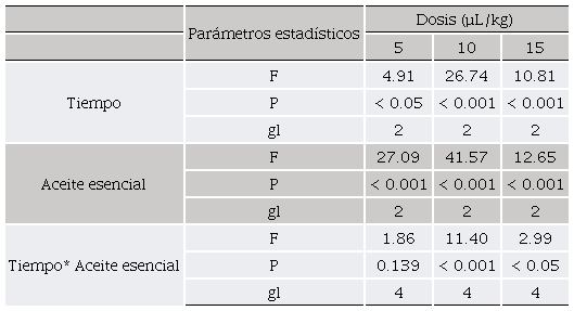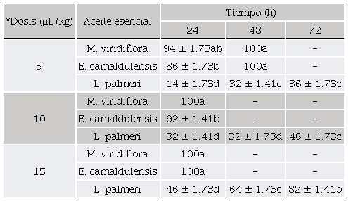 La mortalidad en el tratamiento control fue cero, en el cual no existió una respuesta de muerte natural del insecto adulto en los periodos evaluados. Los tres tipos de aceite esencial mostraron una fuerte actividad contra R. dominica, obteniendo diferentes porcentajes de mortalidad entre los tratamiento y tiempos de exposición (Tabla 1). Además, su efectividad fue mayor al incrementar el tiempo de exposición y la dosis, existiendo una interacción entre los factores probados (Tabla 2). El aceite esencial de M. viridiflora fue el tratamiento que obtuvo una mayor efectividad sobre R. dominica alcanzando el 100% de mortalidad a las 24 h de exposición en todas las dosis probadas; el aceite de E. camaldulensis presentó un efecto intermedio sobre el insecto y obteniendo una mortalidad completa en un periodo de 24 h para las dosis de 10 y 15 µL/kg; el aceite de L. palmeri fue el tratamiento con menor incidencia sobre la plaga obteniendo una mortalidad de 82% con una dosis de 15 µL/kg a las 72 h (Tabla 1 y 2). Sin embargo, la mortalidad obtenida en los tratamientos de L. palmeri a las dosis probadas de 5 y 10 µL/kg se encontraron por debajo del límite establecido del 50% de mortalidad para el uso de productos de origen botánico (Lagunes, 1994).