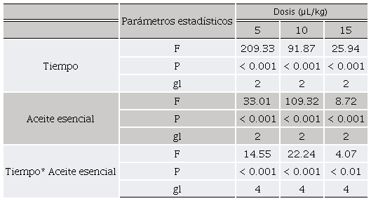 El experimento se llevó a cabo en un arreglo factorial, donde el factor A son los aceites esenciales, factor B dosis (5, 10 y 15 μL/kg) y el factor C tiempos (24, 48 y 72 h) y cinco repeticiones por tratamiento y testigo.