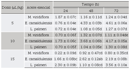 La pérdida de peso para cada aceite esencial fue variando a medida que se trataban con diferentes dosis, en la dosis de 5 µL/kg los aceites que obtuvieron una menor pérdida de peso fueron E. camaldulensis y L. palmeri, para la dosis de 10 µL/kg fueron M. viridiflora y L. palmeri, y finalmente en la dosis de 15 µL/kg fue M. viridiflora. Estos datos fueron registrados a las 24 h de exposición, sugiriendo que al incrementar el periodo de exposición con los aceites esenciales el insecto suele adaptarse a ellos y aumenta su actividad metabólica. La actividad metabólica de R. dominica depende de sus enzimas digestivas que le permiten alimentarse de los granos y están conformadas por isoamilasas que hidrolizan el almidón y enzimas del tipo serina proteasas (Zhu-Salzman et al., 2003; Cinco-Moroyoqui et al., 2008; Osuna-Amarillas et al., 2012).