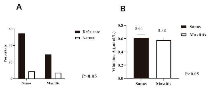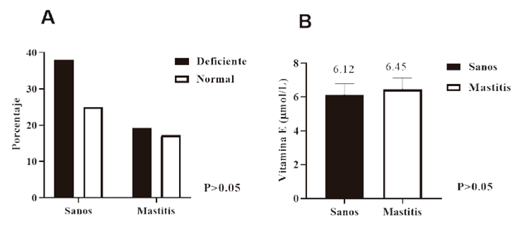 Los niveles séricos de vitamina E entre vacas sanas y con mastitis fueron similares (P>0.05) Figura 1B.