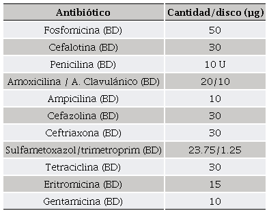 Técnica de disco-difusión en agar. Se realizó un antibiograma a cada una de las cepas aisladas de las muestras de leche, utilizando como cepa control E. coli ATCC 25922, teniendo como resultado los patrones de resistencia a antimicrobianos, mediante la Técnica de Kirby-Bauer (Ituarte-Robles y Bracamonte-Mendoza, 2015). Los antibióticos utilizados se muestran en la Tabla 1.