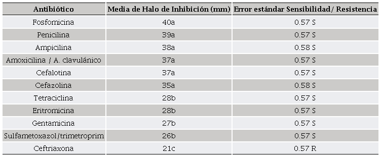 En la Tabla 2, se muestran los resultados de la sensibilidad antimicrobiana que se realizó a las cepas aisladas de las muestras de leche de vacas mastíticas, como se observa a excepción de la ceftriaxona, todos los demás antibióticos muestran ser efectivos ante las cepas probadas en este trabajo.