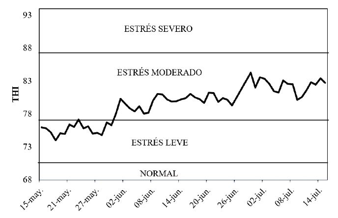 El THI es una medida indirecta para evaluar el estrés calórico de los animales. El THI se determinó, con la ecuación descrita por Collier et al. (2012), en la cual T es la temperatura (°C) y HR es humedad relativa (%):