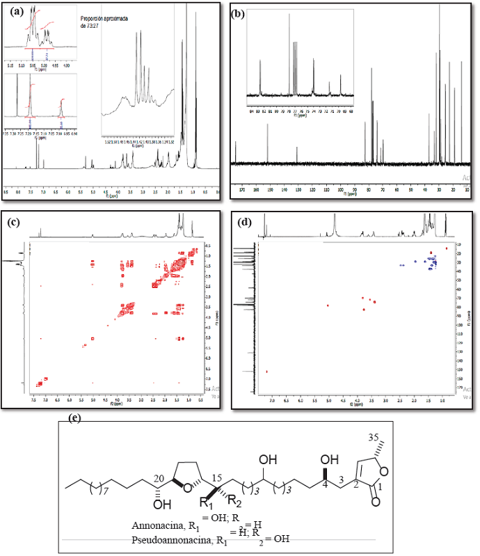 El espectro de correlación heteronuclear a un enlace (HSQC) (Figura 1d) permitió asignar el número de carbonos protonados, entre los que destacan aquellos que soportan grupos funcionales (doble enlace, bases de oxígeno), los adyacentes a estos grupos y los grupos metilenos de las ACGs. La estereoquímica relativa de los centros estereogénicos C-15, C-16, C-19 y C-20 se determinó aplicando la regla de Curran (Curran et al, 2006). En su conjunto, los experimentos de RMN mencionados permitieron determinar que las estructuras de este par de acetogeninas corresponden a la annonacina y la pseudoannonacina (Figura 1e), previamente aisladas de A. muricata.