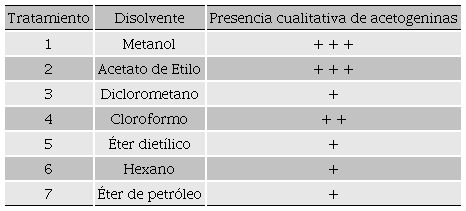 Por otro lado, la mayor presencia de ACGs en los extractos con acetato de etilo y metanol se atribuye a que las ACGs tienen grupos funcionales polares, como grupos hidroxilos (-OH) y un grupo lactónico; así como grupos funcionales apolares, como anillos de tetrahidrofurano y cadena de carbonos; por lo tanto, los compuestos acetogénicos son solubilizados por solventes con polaridad de intermedia a alta, sin ser solubles en agua (Rupprecht et al., 1990; Bermejo et al., 2005). Es conocido que una sustancia es soluble en un disolvente cuando las fuerzas intermoleculares que unen a las moléculas de cada sustancia son menores o similares a las fuerzas de interacción con el disolvente, de tal manera que estas últimas pueden superar las fuerzas intermoleculares del soluto, solubilizándolo o disociándolo (Hassan et al., 2018; Soto et al., 2020).