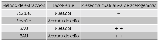 En adición, las tecnologías de extracción de ACGs mayormente reportadas son: fluidos supercríticos (FSC), maceración y método Soxhlet. Con el uso de FSC utilizando como fluido CO2 y como co-solvente etanol, se obtuvieron concentraciones de 0.10-0.37 mg/g de ACGs a partir de semillas de A. muricata, identificando ocho ACGs (12,15-cis-squamostatina-A, squamostatina-A, bullatacina, squamos-tatina-D, squamocina, isodesacetiluvaricina, asiminecina y desacetyluvaricina) (Yang et al., 2009). Por otro lado, con el uso de maceración con cloroformo por 7 días, se obtuvo solo el 0.13% de rendimiento de ACGs totales de semilla de A. muricata (Aguilar-Hernández et al. (2020); mientras que por el método Soxhlet con metanol por 13 h, Ranisaharivony et al. (2015) reportan 0.067% de ACGs purificadas (annonacina, murisolina, annonacinona) a partir de la misma materia prima. Por los rendimientos de extracción de ACGs tan bajos hasta ahora reportados, se siguen estudiando nuevas tecnologías de extracción, y una alternativa es la extracción asistida con ultrasonido (EAU).