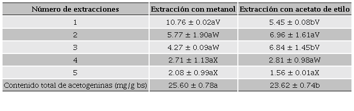 Los datos se expresan como la media ± desviación estándar (n=3). Letras diferentes en la misma fila (a, b) indican diferencias estadísticas significativas por efecto del disolvente para cada extracción y las letras diferentes en la misma columna (w, x, y, z) indican diferencias estadísticas significativas por efecto del número de extracción con el mismo disolvente (α=0.05). (Morales et al., 2004); aunque se requiere de 4 h de extracción con ultrasonido.