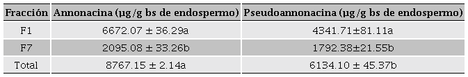 La mayor concentración de ACGs se encontró en la fracción F7, siendo la annonacina la ACG predominante. Esto se debe a que para obtener esa fracción rica en ACGs, se uso una mezcla se separación mayormente polar. El contenido total de anonnacina y de pseudoannonacina en el endospermo fue de 8767.15 y 6134.10 µg/g bs, respectivamente. El contenido de annonacina fue mayor a los reportes descritos por Wurangian (2005) y Ranisaharivony et al. (2015), quienes encontraron 450 µg/g bs y 470 µg/g de annonacina extraída de semillas de A. muricata, respectivamente; utilizando el método soxhlet con etanol como disolvente.