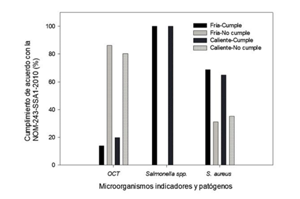 De manera general, los resultados microbiológicos muestran un mayor porcentaje de incumplimiento en leche caliente; esto se debe a que la temperatura de conservación es un factor importante para acelerar o controlar la reproducción microbiana, según sea el caso. El incremento de microorganismos alterantes y patógenos tiene un efecto directo sobre la calidad y la vida útil del queso o derivados lácteos (Montes de Oca-Flores et al., 2019), por lo que es importante cuidar que los conteos no sobrepasen los límites establecidos para cada grupo en la materia prima. Sin embargo, es importante recalcar que la normatividad mexicana no cuenta con límites máximos permisibles para los microorganismos mohos, levaduras y mesofílicos aerobios para leche utilizada como materia prima y en el resto de los microorganismos indicadores y patógenos se asume que la leche es pasteurizada; por ende, al no establecer estos rangos repercute en la vida útil y de anaquel de los productos lácteos elaborados con leche cruda.