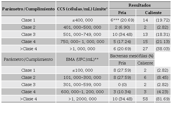 Las características nutricionales de la leche, el contenido de agua y pH cercano a la neutralidad, hacen de este alimento un sustrato ideal para el desarrollo de microorganismos (Gómez y Mejía, 2005; Quigley et al., 2011). En este contexto, el Consejo para el Fomento de la Calidad de la Leche y sus derivados (COFOCALEC) propuso una clasificación aplicable para determinar el grado de cumplimiento de calidad en leche cruda de vaca destinada a la fabricación e industrialización de productos para consumo humano (NMX-F-700-COFOCALEC-2012). En la Tabla 1 se muestran los resultados de CCS y BMA comparando contra los criterios que establece COFOCALEC; en lo referente al CCS, la mayoría de las muestras se clasificaron como clase 4 y superior (>7.5 x 105 CCS/mL); lo cual representa el 37.9 % de las muestras de leche fría y el 59.1 % de leche caliente. Por otra parte, solo el 20.69 % de leche fría y el 19.72 % de caliente se clasificaron como clase uno (≤4 × 105 CCS/mL). A pesar de las diferencias matemáticas, no se encontraron diferencias significativas de esta variable respecto a los factores ordeño y tratamiento (ver Tabla 2). De acuerdo con la norma NMX-F-700-COFO-CALEC-2012 solo la leche clasificada como clase 1 se debería de utilizar en la producción de alimentos para consumo humano, ya que conteos elevados de CS afectan negativamente a la producción y composición de la leche (Citalan et al., 2016). Resultados similares fueron observados en siete regiones representativas de Puno, Perú (Brousett-Minaya et al., 2015), en dicho trabajo se concluyó que las inadecuadas prácticas de ordeño provocan problemas de mastitis en el ganado, lo que influye en la calidad e inocuidad de la leche.