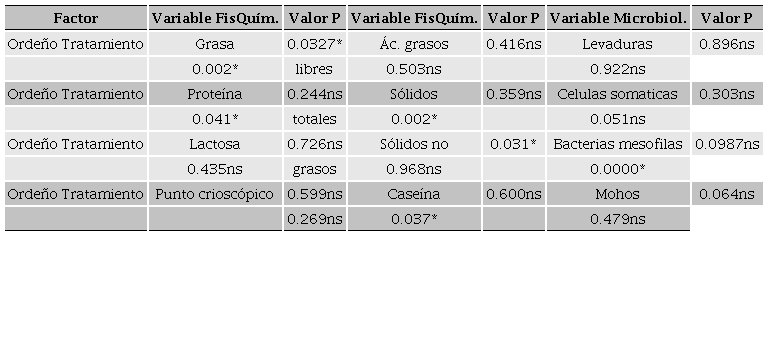 Los factores de estudio fueron el ordeño, el cual podía ser manual o mecánico y el tratamiento, considerando si la leche es transportada y entregada fría (4 °C) o caliente (temperatura ambiente) a la empresa. Las variables microbiológicas fueron transformadas a Log10 para su análisis estadístico. Se comprobó normalidad y homogeneidad de varianza en todas las variables, las cuales mostraron distribución normal con un valor P> 0.01 utilizando la prueba de Anderson-Darling. Fue requerida la transformación Johnson para tratar los datos de las variables grasa, proteína, lactosa, punto crioscópico, ácidos grasos libres y levaduras. Posteriormente se realizó un ANOVA simple sobre las variables fisicoquímicas y microbiológicas con los factores estudiados (ordeño y tratamiento) comparadas con un valor P< 0.05.