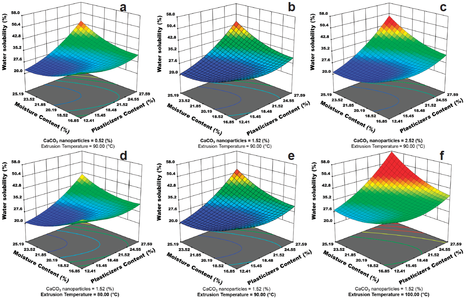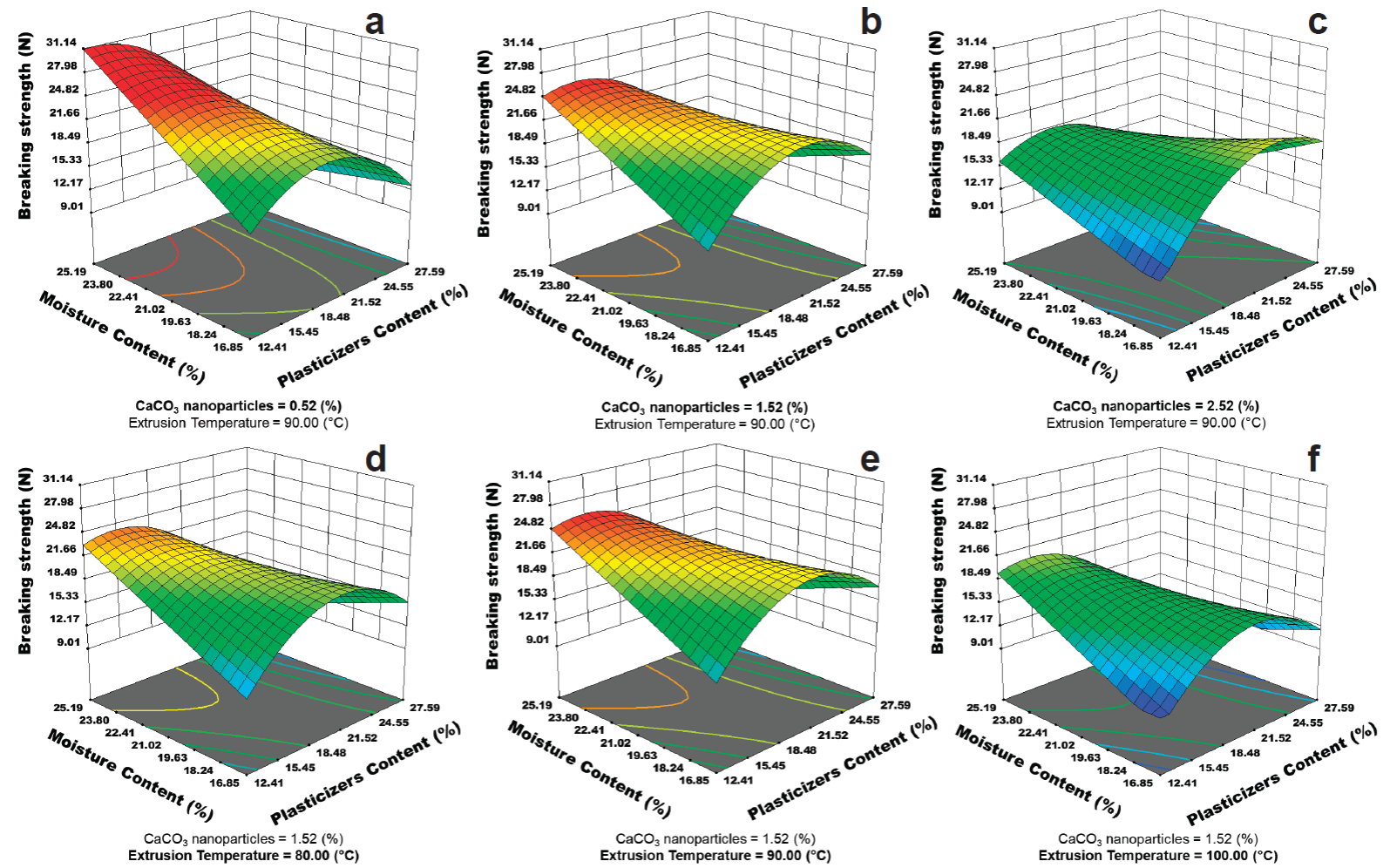 Where: yi = generic response; b 1...44 = regression coefficients; X1 = CaCO3 nanoparticles, X2 = Extrusion Temperature and X3 = Plasticizers Content and X4 = Moisture Content. The numerical method was applied as optimization technique, where the main criteria for determining the optimal treatment to produce EF were better BS and D (highest values), and WVP and S (lowest values).