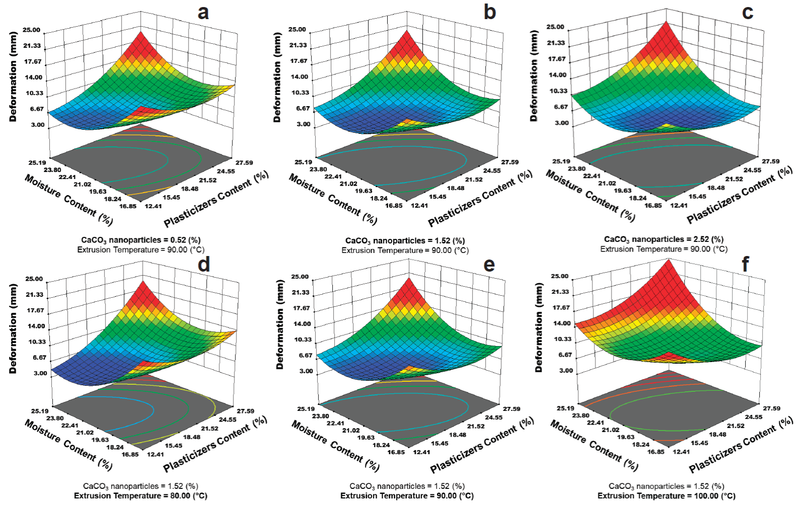 Figure 2(d-f) shows the temperature effect on D. An increase in D was observed, perhaps caused by damaged structures. This damage produced fewer rigid structures and generated greater deformation. However, a low MC and an increased in PC, caused a decrease on D. This effect could be attributed to the increment in PC and temperature, which could generate structures that are physically weaker and therefore less deformable. These results are different than those reported by Calderón-Castro et al. (2018), who found no significant effect of extrusion temperature on deformation.