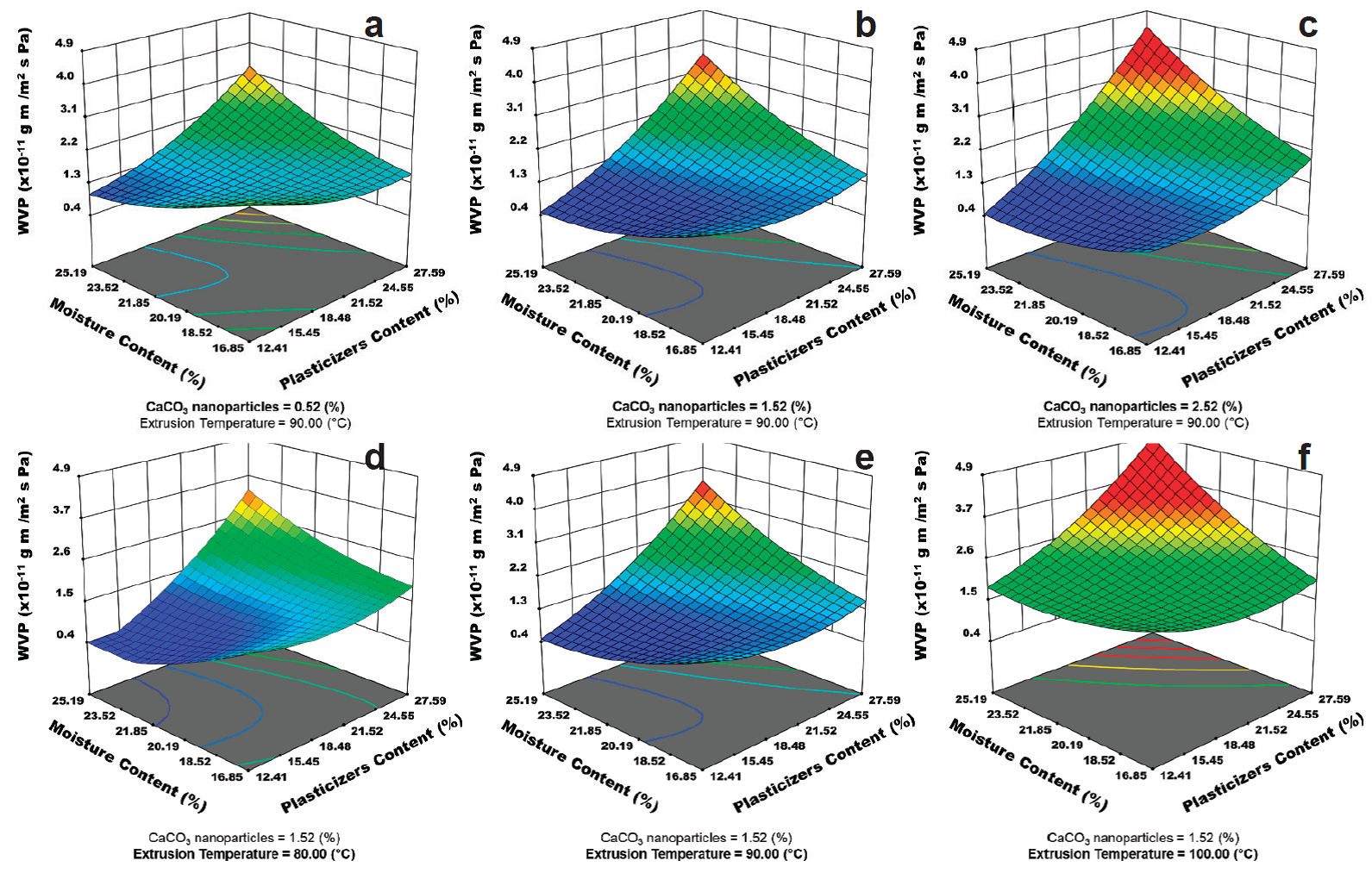 Figure 3(d-f) shows the temperature effect. An increment in temperature produce an increase of WVP. This could be due to a major gelatinization producing molecular disruption of starch chains, increasing the presence of short chains of starch structures, with higher water affinity. These results agrees with Fitch‐Vargas et al. (2016) who reported changes in macromolecular matrix with the temperature and therefore an increase in WVP.