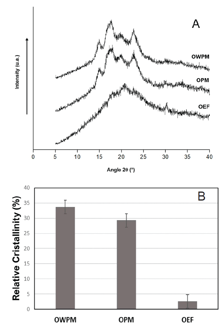 Changes in X ray diffraction patterns affect relative crystallinity in materials processed. Figure 5B shows the relative crystallinity values of the materials studied. OWPM crystallinity was higher than the crystallinity of OPM, showing that extrusion process and plasticizers contributed lightly to starch granules fragmentation, reducing crystalline regions. Figure (5B) also shows that the OEF registered the lowest crystallinity value, which could be due to the casting technique, where starches gelatinization is complete, considerably reducing the crystalline regions. Furthermore, addition of plasticizers contributed to crystallinity decrease. Oliveira et al. (2017) studied the effect of temperature, feed moisture, and whole grain wheat flour on extrusion process severity and degree of starch transformation; they found that during extrusion, loss of crystallinity is caused by mechanical disruption of the molecular bonds within the extruder, due to the intense shear fields. Also, they found relative crystallinities around 25-34 % in raw materials, while processed material was 16-23 %. These results are consistent with those found in the present work.