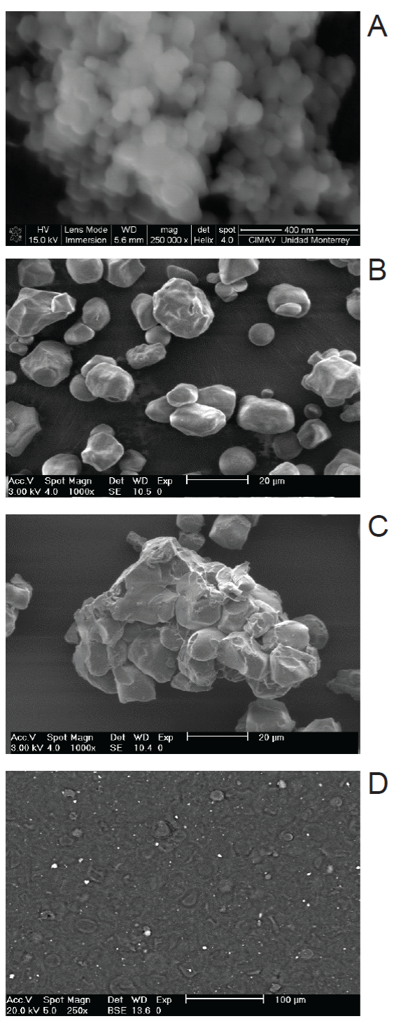 Materials obtained were evaluated with SEM analysis, according to the Rodríguez-Castellanos et al. (2015) procedure. Briefly, a powder sample of both, starch and OWPM, were dispersed over the SEM plate and the films were fractured by previously cutting a film piece. Then, they were immersed in liquid nitrogen for 10 seconds, breaked and placed on the copper sample plate holder with 1.2 cm diameter carbon adhesive tape. Samples were placed and covered for 10 min with a light gold layer, then submit for posterior analysis. A SEM (Philips®, Model XL30 ESEM, Eindhoven, Netherlands) was used, employing a secondary electron detector with 15 KV of acceleration. CCNP powder samples were placed on a carboncoated copper grid and characterized in a Scanning Electron Field Emission Microscope (FEI, Nova NanoSEM 200, Shinagawaku, Tokio) with 15 kV acceleration and helix detector in low vacuum conditions.