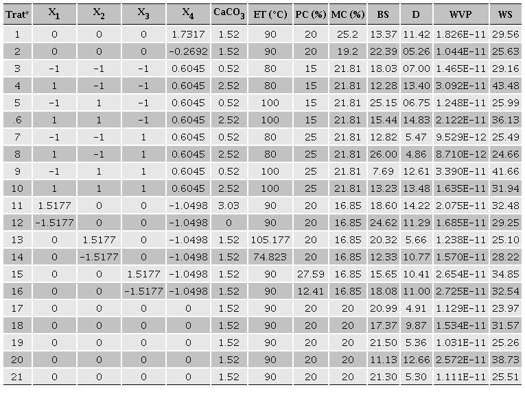 A hybrid design D416B of the response surface methodology (RSM) with four factors was used (Roquemore, 1976): CaCO3 nanoparticles (CCNP: 0.00 - 3.03 %), extrusión temperature (ET, 74.82 - 105.18 °C), plasticizers content (PC: 12.41 - 27.59 %) and moisture content (MC: 16.85 - 25.19 %). All the independent variable levels were selected according to preliminary experiments and technical limitations of the study at five levels was performed. The whole design consisted of 21 experimental points carried out in random order, which included 16 factorial and axial points, 5 center points, the center of the design was used to allow for estimation of a pure error sum of squares (Table I). A second order polynomial model was used to predict the experimental behavior: