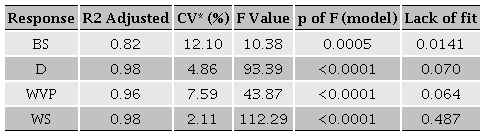 Quadratic model for predicting the optimal point was expressed according to the response surface methodology (RSM) The significance of the models was tested using variance analysis (F test). The significances of all terms in the polynomial were judged statistically by computing the F-value at a probability (p≤) of 0.001, 0.01 or 0.05. The regression coefficients were then used to make statistical calculations to generate dimensional and contour maps from the regression models. The response surface regression (RSREG) procedure was determined with Design Expert® Software Version 11.0 (Stat-Ease, Inc., Minn., U.S.A.). The microstructural characterization of the optimal treatment was analyzed by LSD Fisher means comparison (p ≤ 0.05) with StathGraphics Centurion XVIII.
