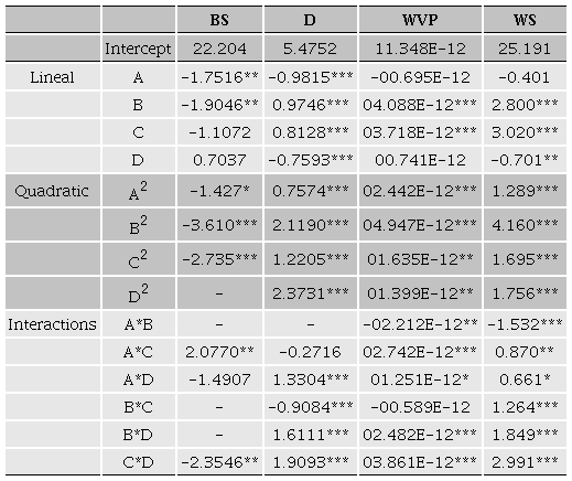 BS showed a significant model of regression with R2 values of 0.82, coefficient of variation CV = 12.10, and p of F= 0.0005 and showing lack of fit (Table 2). Also, the statistical analysis (Table 3) showed the CCNP and ET in their linear terms (p ≤ 0.05), were the factors that had the most significant effect on the BS. All quadratic terms had a significant effect, except MC. Only CCNP-PC and PC-MC interactions had a significant effect (p ≤0.01).