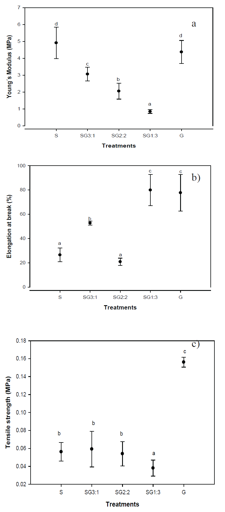 The elongation at break depends, as tensile strength do, on different factors in mixed system between starch and gelatin which include the hydrogen bonding through their hydroxyl groups. The anionic domains of starch form a network with the cationic domains of gelatin molecules between anionic ones (Fonkwe et al., 2003). G sample and the SG 1:3 mixture showed the highest deformation with 80% compared to the rest of the samples. Previous work carried out in gelatin films in presence of glycerol, have shown that glycerol is compatible with gelatin, and increases significantly its plasticity resulting in higher flexibility and transparency (Al-Hassan and Norziah, 2012; Park et al., 2008).
