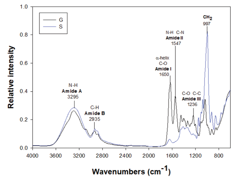 Muyonga, J. H., Cole, C. G. B., and Duodu, K. G. 2004. Fourier transform infrared (FTIR) spectroscopic study of acid soluble collagen and gelatin from skins and bones of young and adult Nile perch (Lates niloticus). Food Chem istry, 86(3): 325-332.