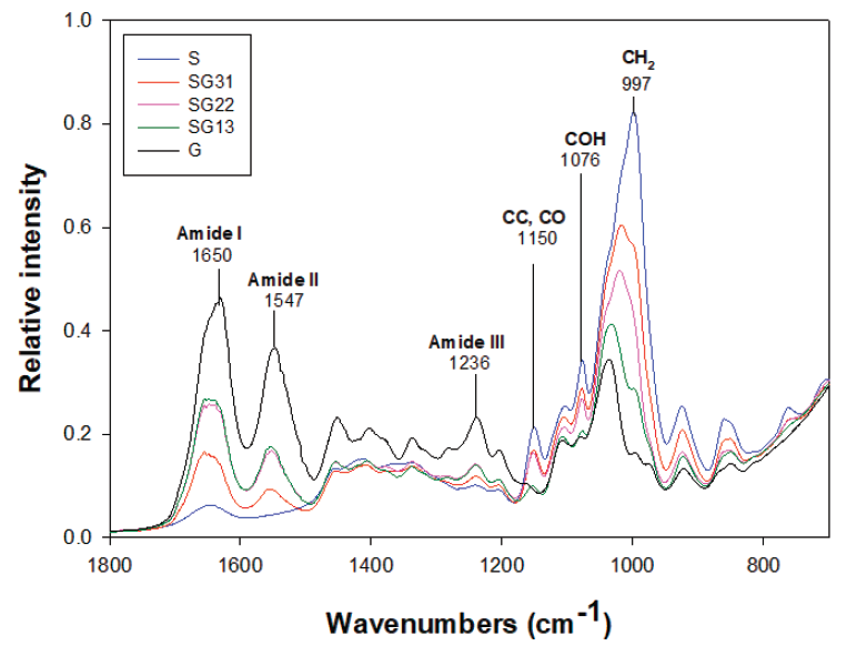 During the drying of the film solutions, the molecules followed a tendency to reorganize towards its native structure (Ledward, 1986; Parker and Ring, 2005). The speed of drying in S treatments were higher than the speed of the reorganization of its structure, resulting in a predominance of the amorphous proportion in films. However, the G film reached a partial reorganization to collagen-like structure before the filmogenic solution dried (Aguirre-Álvarez et al., 2011). The films from samples SG 3:1, SG 2:2, SG1:3 and G were produced from gel to solid state with a more ordered structure. This behavior is congruent with the observed data in the determination of crystallinity as the G films presented 64.96 % of crystallinity. The ratio of crystallinity decreased with the presence of starch in the filmogenic solution up to 37.86 % in the SG 2:2 sample. This could be the reason why the sample G resulted more brittle and with higher tensile strength compared to the rest of the samples.