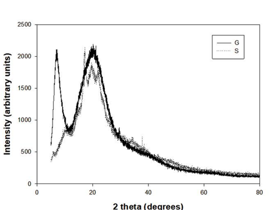 Films presented a pattern of diffraction characteristic of a partially crystalline material. Figure 4 shows the typical diffractograms for G and S sample. G sample showed peaks located in the region around 7° and 20° (Tao et al., 2018). These peaks are associated with diameter and intensity of the triple helix structure reconstructed from collagen (Rivero et al., 2010).