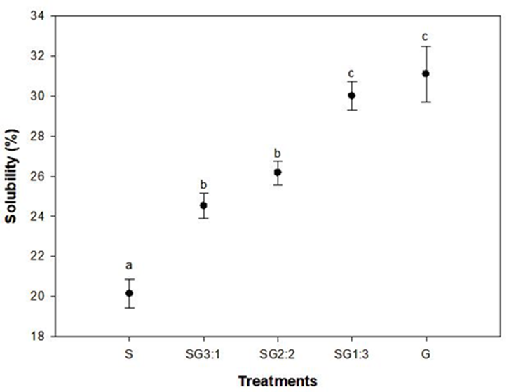 The solubility of edible films such as starch-gelatin results of greater importance when applied as a packaging material in foods. Figure 5 shows significant differences between treatments (P<0.05). The higher the amount of gelatin, the higher the solubility of films.
