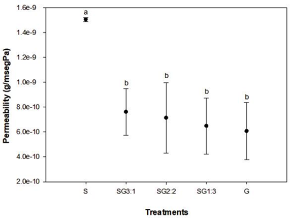 The water vapor permeability (WVP) is the flux of molecules through a material normalized to a pressure gradient (Tyuftin and Kerry, 2021). WVP of films prepared with starch (S) resulted in greater amount compared to the films prepared with gelatin. Figure 6 shows that the presence of gelatin decreased the WVP no matter what the amount of gelatin was added. Sample S showed high WVP due to its abundance of hydrophilic hydroxyl groups present within amylose concentration of chayotextle starch. This affinity to water molecules promoted the migration of water vapor molecules through the film (Alias and Mhd Sarbon, 2019). The same trend was observed in previous work carried out in films prepared with sago starch-gelatin and glycerol (Al-Hassan and Norziah, 2012). The greater the amount of starch, the higher the WVP was obtained. For treatments in presence of gelatin, it is believed that the starch hydroxyl groups interacted easily with gelatin amino groups via hydrogen bonds to form physically reticulated networks with more compact structure between starch and gelatin, reducing permeation of water molecules into the matrix of films (Ahmad et al., 2015; Wang et al., 2017; Xu et al., 2005). This behavior could be explained in terms of differences in structural properties as the hydrophilic character of the matrix promoted different transport rates of water adsorption capacity in films containing gelatin (Moreno et al., 2016). Previous works have demonstrated that WVP of films depended on several factor such as the ratio between the amorphous and crystalline zones (Garcia et al., 2000), and the greater the crystalline/amorphous ratio, the lower the permeability (Donhowe and Fennema, 1993). The same behavior was observed in films prepared with chayotextle starch and cellulose nanoparticles (Aila-Suárez et al., 2013), the higher the amount of cellulose nanoparticle, the higher the crystallinity of films was obtained, shifting the WVP to lower values.