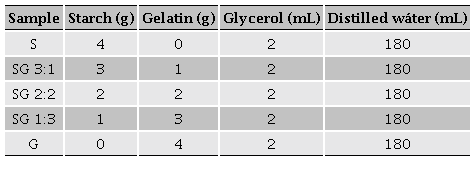 Firstly, 160 mL of distilled water were added to a mini-reactor (300 mL) followed by 2 g of glycerol and 10 min of stirring (Lightning Lab MasterSPX-Mixer). Different treatments of 4, 3, 2, 1, and 0 g of chayotextle starch were added to the corresponding reactor. The temperature solution was raised at 85 ºC for 10 min. The solution was cooled down to 60 ºC to add gelatin. Secondly, 0, 1, 2, 3 and 4 g of porcine gelatin with 275°B (Wilson Porcine Skin) were placed in a corresponding flask containing 20 mL of water at room temperature for swelling of gelatin. After 10 min of swelling, the temperature of the gelatin solution was increased to 55 ºC and maintained for 10 min with constant stirring for melting of gelatin. The melted gelatin was added to the starch-glycerol solution and stirred for 10 min to homogenize the mixture.