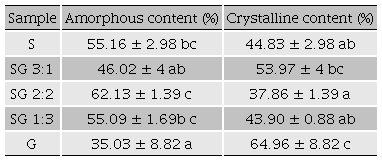 From Table 2, it can be observed that S sample reported significant differences (P < 0.05) with 55.15 % of amorphous content and 44.83% of crystalline content. Comparing these results with G sample, a lower amount of amorphous content (35.03 %) was observed. However, the amorphous content of mixed samples resulted significantly (P < 0.05) higher compared to Gelatin. The SG 2:2 sample showed the higher content with 62.13 %. The higher the amount of starch in films formulation, the greater the amorphous proportion was measured.