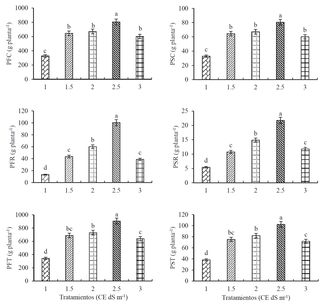 Las SNs de CE baja (1, 1.5 y 2 dS m-1) causaron una menor acumulación de biomasa, probablemente debido a un déficit de nutrientes, mientras que la SN con la mayor CE (3 dS m-1) pudo causar una restricción en la absorción de agua y nu-trientes, provocando así un déficit hídrico, nutrimental y un estado de toxicidad por la acumulación de iones en la rizosfera que afectaron negativamente la producción de biomasa (Amalfitano et al., 2017).