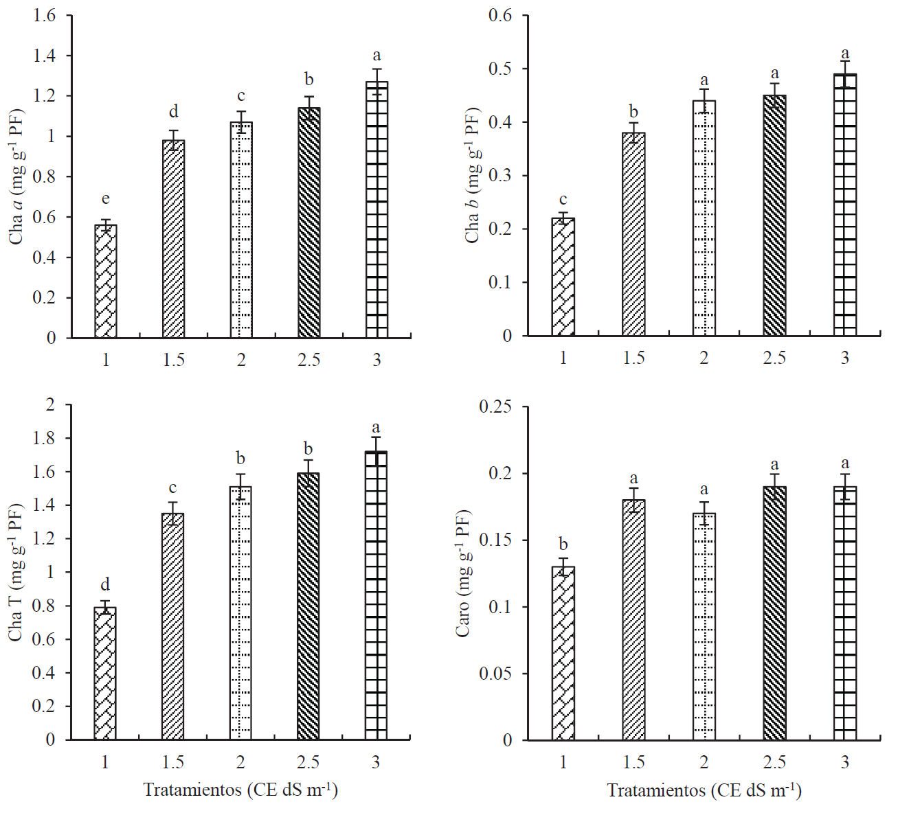 La actividad fotosintética de las plantas está en función de la correcta nutrición y diferentes fenómenos ambientales, por lo cual, es de gran importancia nutrir a los cultivos de forma correcta, de acuerdo con su etapa fenológica y proporcionarle los cuidados necesarios (Horchani et al., 2010). El proceso fotosintético está relacionado con el contenido de diferentes elementos esenciales, entre ellos nitrógeno (N), potasio (K), magnesio (Mg), fósforo (P), hierro (Fe), entre otros (Yoon et al., 2019). En esta investigación se observó que la concentración de pigmentos incrementó conforme se aumentó la CE de la SN. Se ha sugerido que al incrementar la CE de las SNs se reduce la absorción de agua y nutrientes por la planta, fenómenos que se han asociado con un proceso fotosintético más eficiente (Khoshbakht et al., 2015). Silva et al. (2019) también observaron que al incrementar la CE (1, 1.3, 1.6, 1.9 y 2.2 dS m-1) de la SN se incrementó la concentración de clorofila a, clorofila b, clorofila total y carotenoides en lechuga. Morales-Espinoza et al. (2019) mencionan que con el incremento de la salinidad se aumenta el contenido de clorofila a, clorofila b y clorofila total en las hojas de tomate.