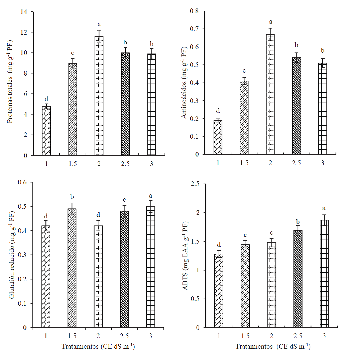 Los compuestos nitrogenados, como las proteínas, aminoácidos y glutatión, están involucrados en la acumulación de biomasa en los cultivos, sin embargo, también están involucrados en el sistema de defensa de las plantas al tener efectos antioxidantes (Zechmann, 2020). Un antioxidante es considerado cualquier molécula que a muy baja concentración tiene la capacidad de reducir moléculas oxidantes (Liu et al., 2018). En la presente investigación se observó que el contenido de proteínas y aminoácidos se incrementó conforme se elevó la CE de la SN hasta 2 dS m-1, para después disminuir. Sin embargo, en lo que respecta a glutatión reducido y capacidad antioxidante hidrofílica, se observó que los valores de estas variables de respuesta aumentaron gradualmente al incrementar la CE.