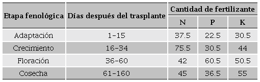 Se utilizó un diseño experimental en bloques completos al azar con cuatro tratamientos y cuatro repeticiones por tratamiento. Las parcelas que representaron las repeticiones contenían 30 plantas.