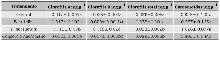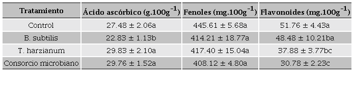 Los carotenoides son pigmentos que le confieren color a los frutos y tienen propiedades antioxidantes. Los frutos inoculados con B. subtilis and T. harzianum, mostraron un efecto positivo en el nivel de carotenoides, estos inoculantes microbianos fueron iguales estadísticamente (P ≤ 0.05) entre sí, pero diferentes al consorcio microbiano que fue estadísticamente (P ≤ 0.05) igual al control (Tabla 4).