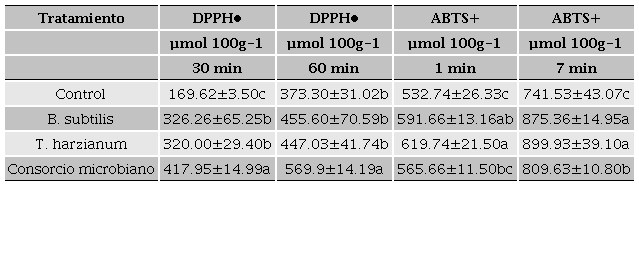 Por otra parte, los tratamientos con B. subtilis y T. harzianum mostraron altos niveles de la actividad antioxidante en comparación con el control con el método del radical ABTS•+ en ambos tiempos (1 y 7 min).