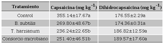 Los inoculantes microbianos fueron estadísticamente iguales entre sí (P ≤ 0.05) para los contenidos de capsaicina, pero diferentes al control quien fue predominante. En contraste, para los contenidos de dihidrocapsaicina no existieron diferencias estadísticas significativas (P ≤ 0.05) entre los inoculantes microbianos y el control (Tabla 6).