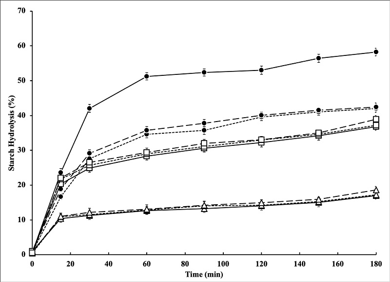 In relation to the lintnerized samples, it was observed that the hydrochloric acid chemical treatment decreased the starch hydrolysis rate compared to the native starches in values of ≈ 21, 5, and 3 % for the corn, malanga, and apple samples, respectively; however, this reduction was lower than the values obtained in the samples subjected to hydrothermal treatment (autoclaved). The maximum rate of hydrolysis reached by the lintnerized starches was observed in the 37 - 39% range. These values agree with those reported by Akanbi et al. (2019), who modified orange sweet potato starch by lintnerization, reporting a hydrolysis rate of ≈ 35 %.
