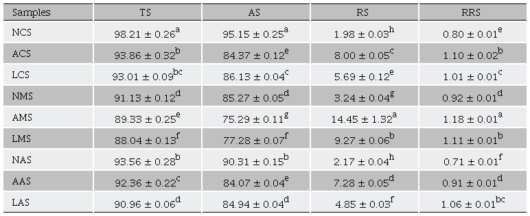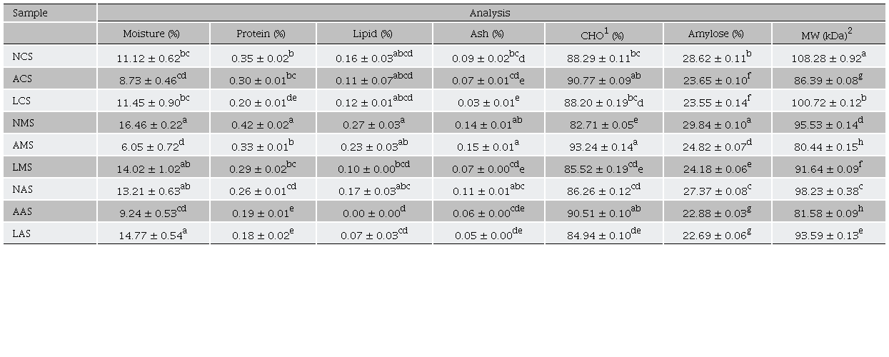 The proximal chemical analysis is shown in Table 1. The NMS and NAS, as well as their respective lintnerized starches (LMS and LAS), presented the highest moisture contents with values that ranged from ≈ 13 % (NAS) up to ≈ 16 % (NMS) although no significant differences were observed between them (p > 0.05). On the other hand, every starch subjected to the physical processing of autoclaving presented the lowest moisture percentages, in the following descending order: AAS > ACS > AMS; however, no significant differences (p > 0.05) were observed among them. In this regard, lower moisture values have been reported in native corn starches (6.5 - 8.5 %) (Bustillos-Rodríguez et al., 2018), native oat starch (10.03 - 10.63 %) (Shah et al., 2016) and native (4.89 %) and lintnerized (7.99 %) plantain starch (Aparicio-Saguilán et al., 2005). Recently, it was reported that the moisture content in powders is an essential factor in flow and other mechanical properties and is highly dependent on the method used for its determination, the degree or level of drying, and the humidity in the surrounding atmosphere (Juarez-Enriquez et al., 2019).
