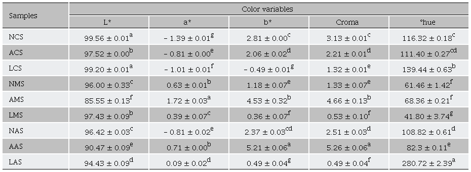 In general, the native and lintnerized malanga and apple starches showed differences in the color variables L*, a*, chroma, and °hue with the native starch and the LCS, respectively, except for the b* coordinate; where a similar value was observed in NAS to that obtained in NCS, and LAS was similar to LCS. Regarding the autoclaved malanga and apple starches, these presented differences in L*, a*, b*, chroma, and °hue with respect to ACS.